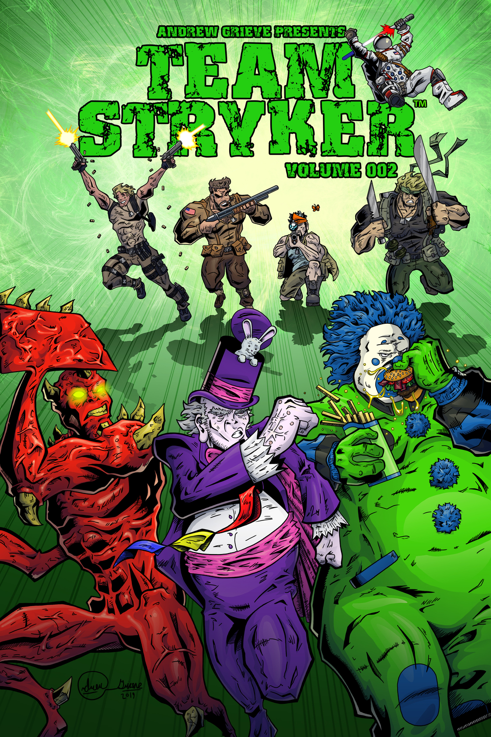 Team Stryker Volume 002 contains Missions 006-010! Join Eagleheart, Deadeye, Casanova and V-Scope as they fight new threats from Space Commies to a Sad Magician and much more!